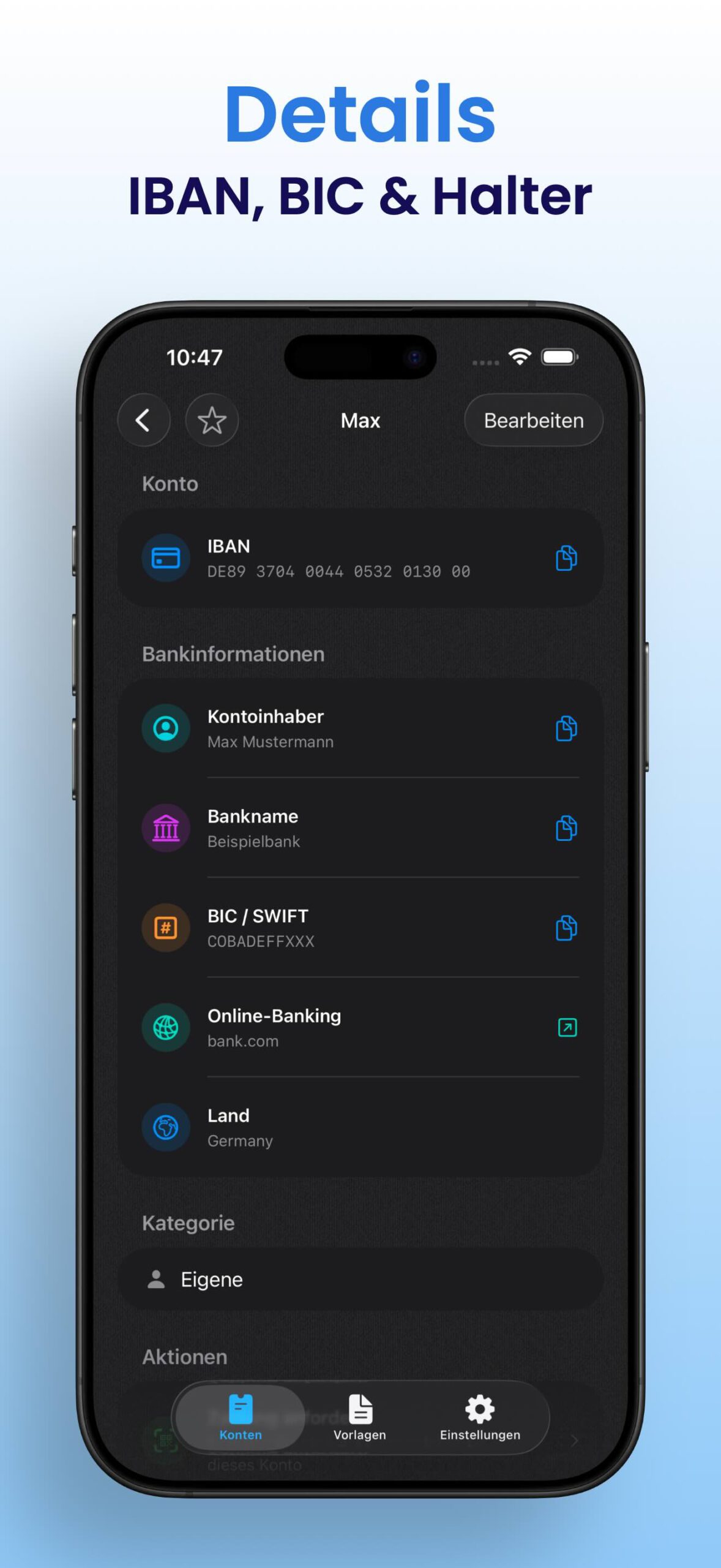 IBAN, BIC und Kontoinhaber auf einen Blick. Übersichtliche Kartenansicht mit automatischer Länder- und IBAN-Prüfung.