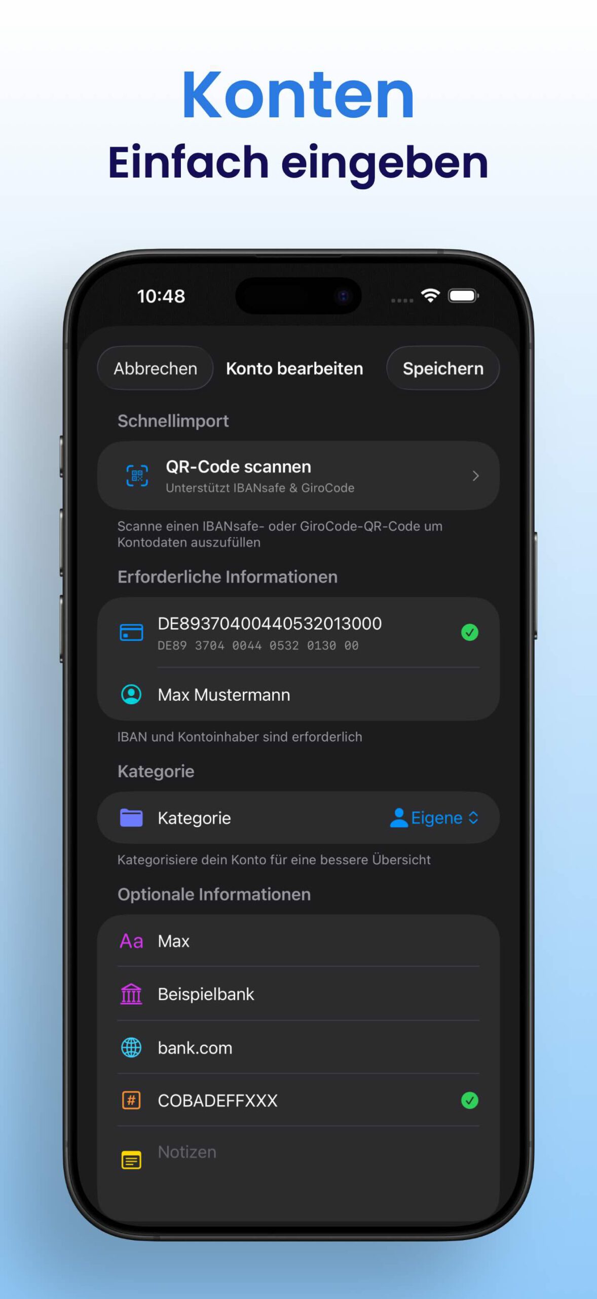 IBAN aus der Zwischenablage übernehmen, QR/GiroCode scannen oder manuell hinzufügen – sofort valide und einsatzbereit.