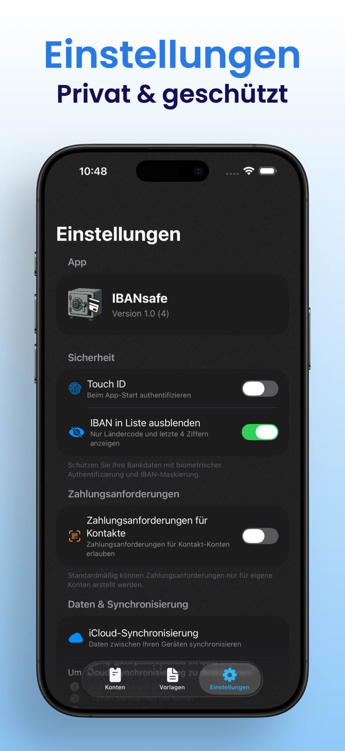Alle Daten werden lokal gespeichert, optional per iCloud synchronisiert und durch Face ID / Touch ID geschützt.